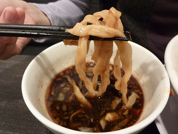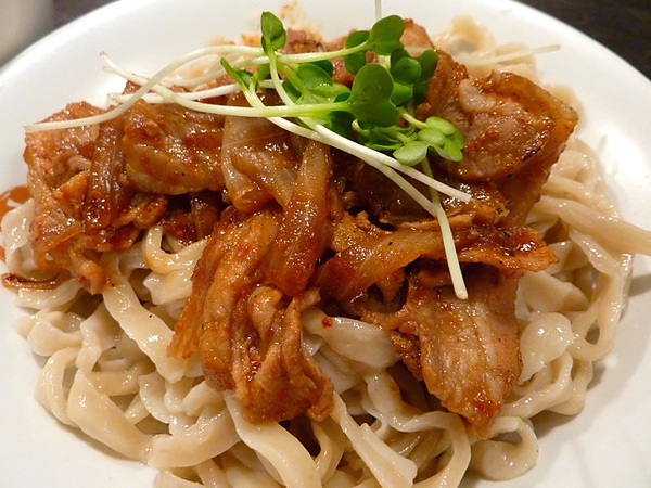 老爺聽了再吃一口,也覺得有點像。這麵條像刀削麵,沾麵用的湯汁又不似一般的豚骨湯頭,比較像是清淡的魚介柴魚湯加上洋蔥、醋的味道,我會說他是很有中華麵感的一道日本拉麵。