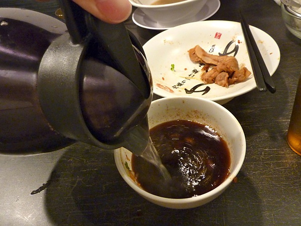 最後可以和店家要「割スープ」(wali-soup),是沒有鹹味的高湯,加進湯汁,這一碗鹹鹹的湯汁就變成一碗好喝的湯囉。
